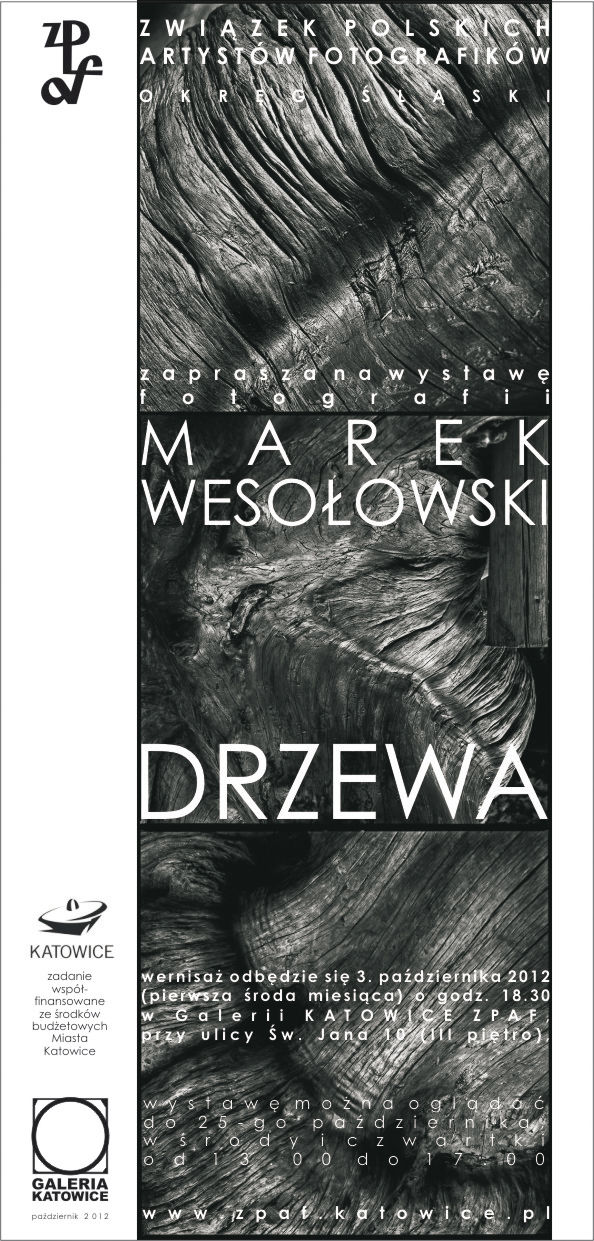 Związek Polskich Artystów Fotografików Okręg Śląski serdecznie zaprasza 03 X 2012 o godz 18,30 na wernisaż wystawy fotografii: Marek Wesołowski ” DRZEWA” Wernisaż odbędzie się w Galerii Katowice mieszczącej się w Katowicach przy ul. Św. Jana 10 III piętro. Wystawę można oglądać do 25 października