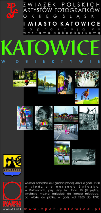 Związek Polskich Artystów Fotografików Okręg Śląski oraz Urząd Miasta Katowice serdecznie zapraszają 05 XII 2012 o godz 18,30 na wystawę pokonkursową “KATOWICE W OBIEKTYWIE”.