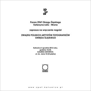 Prezes Związku Polskich Artystów Fotografików Okręgu Śląskiego Katarzyna Łata ‑Wrona wraz z zarządem zapraszają 05 XII 2012 o godz 18,30 na uroczystość wręczenia nagród Okręgu Śląskiego ZPAF. Uroczystość będzie towarzyszyć wystawie pokonkursowej „KATOWICE W OBIEKTYWIE”.