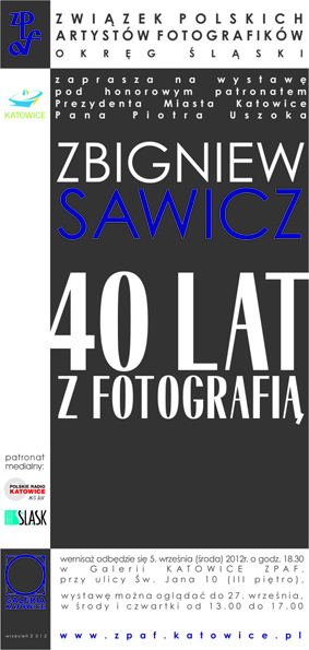 serdecznie zaprasza 05 IX 2012 o godz 18,30 na wernisaż wystawy fotografii: ” ZBIGNIEW SAWICZ 40 LAT Z FOTOGRAFIĄ” Wernisaż odbędzie się w Galerii Katowice mieszczącej się w Katowicach przy ul. Św. Jana 10 III piętro. Wystawę można oglądać do 27 września