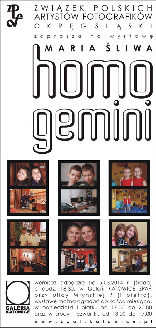 Związek Polskich Artystów Fotografików Okręg Śląski zaprasza 05 III 2014 roku o godz 18.30 na wernisaż wystawy Maria Śliwa “homo gemini”.