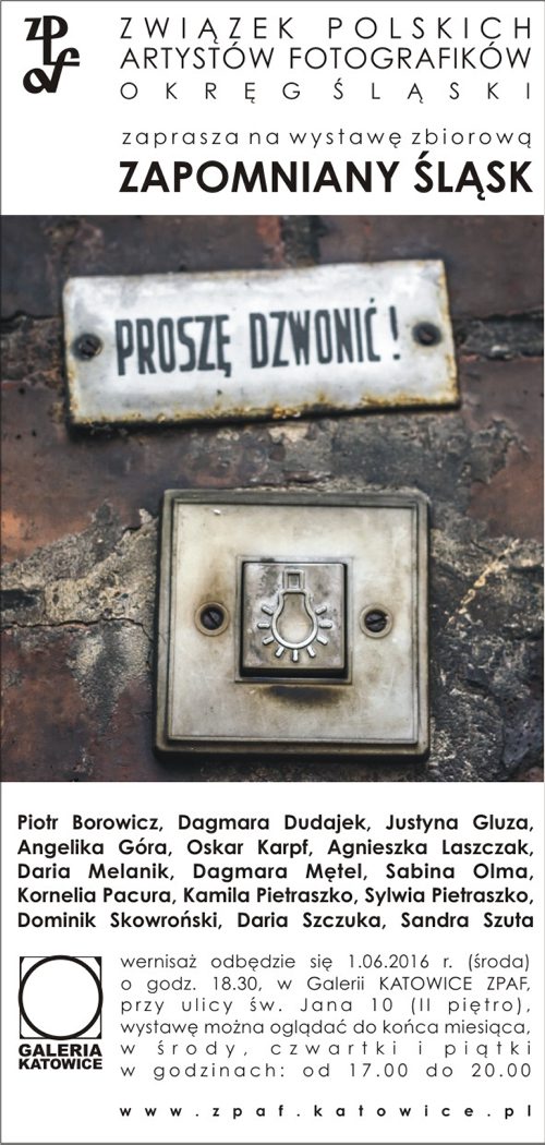 Związek Polskich Artystów Fotografików Okręg Śląski zaprasza 1 czerwca 2016 roku o godz 18.30 na wernisaż zbiorowej wystawy fotografii “ZAPOMNIANY ŚLĄSK”. Wernisaż odbędzie się w Galerii Katowice mieszczącej się w Katowicach przy ul. Św. Jana 10 (II piętro). Wystawę można oglądać do końca czerwca 2016 w środy, czwartki i piątki w godzinach od 17.00 do 20.00.
