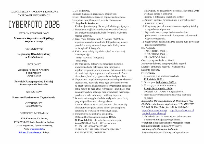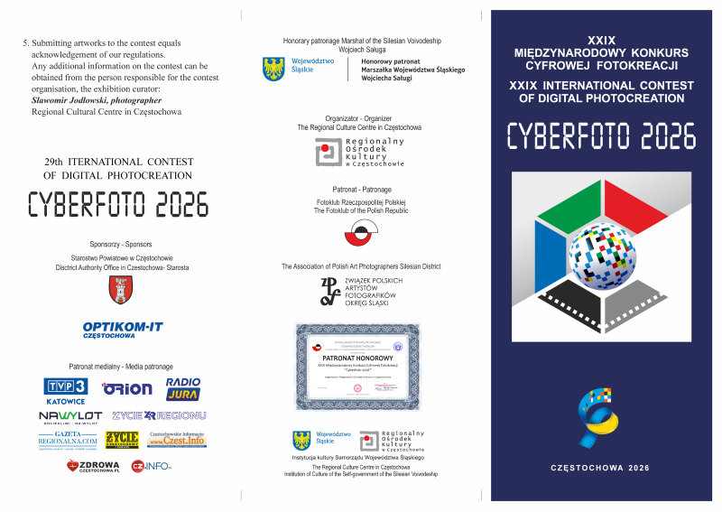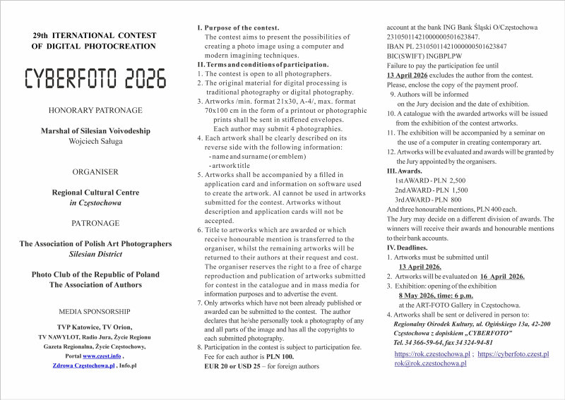 Polecamy XIX Międzynarodowy Konkurs Cyfrowej Fotokreacji CYBERFOTO 2026 INFORMACJE DO POBRANIA karta zgloszenia cyberfoto2026_PL karta zgloszenia cyberfoto2026_EN