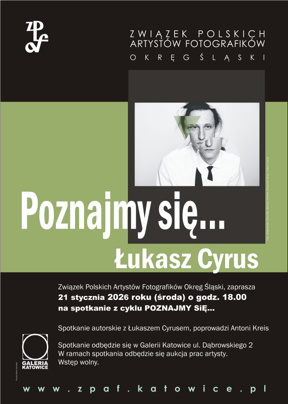 Związek Polskich Artystów Fotografików Okręg Śląski zaprasza 21 stycznia 2026 roku o godz. 18.00 na spotkanie z Łukaszem Cyrusem w ramach cyklu „Poznajmy się”. Spotkanie, które poprowadzi Antoni Kreis, odbędzie się w „Galerii Katowice” Związku Polskich Artystów Fotografików Okręg Śląski przy ul. Dąbrowskiego 2. Wydarzenie będzie rejestrowane. Wstęp wolny.