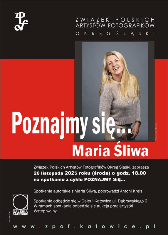 Związek Pol­s­kich Artys­tów Fotografików Okręg Śląs­ki zaprasza 26 listopa­da 2025 roku o godz. 18.00 na spotkanie z Mar­ią Śli­wą w ramach cyk­lu „Poz­na­jmy się”. Spotkanie, które poprowadzi Antoni Kreis, odbędzie się w „Galerii Katow­ice” Związku Pol­s­kich Artys­tów Fotografików Okręg Śląs­ki przy ul. Dąbrowskiego 2. Wydarze­nie będzie reje­strowane. Wstęp wolny.