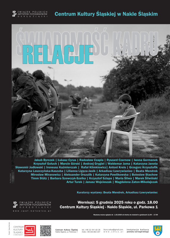 Związek Polskich Artystów Fotografików Okręg Śląski oraz Centrum Kultury Śląskiej w Nakle Śląskim zapraszają na zbiorową wystawę wernisaż fotografii członków ZPAF Okręg Śląski “Relacje” z cyklu “Świadomość kadru”. Wernisaż odbędzie się 5 grudnia 2025 roku o godz. 18.00 w Centrum Kultury Śląskiej w Nakle Śląskim przy ul. Parkowej 1. Wystawę można oglądaċ do 1 lutego 2026 roku od wtorku do niedzieli w godzinach 11.00 – 17.00. Kuratorzy wystawy: Beata Mendrek, Arkadiusz Ławrywianiec. Serdecznie zapraszamy.