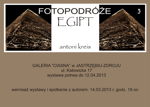 Związek Polskich Artystów Fotografików Okręg Śląski serdecznie zaprasza 14 III 2013 o godz 18,00 na wernisaż wystawy fotografii: Antoni Kreis „Fotopodróże Egipt”.