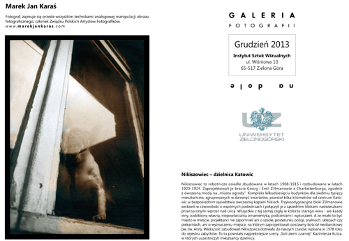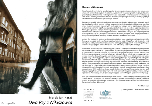 Instytut Sztuk Wizualnych Uniwersytetu Zielonogórskiego oraz Związek Polskich Artystów Fotografików Okręg Śląski zapraszają na wernisaż wystawy fotografii Marka Jana Karasia, “Dwa Psy z Nikiszowca”. Wernisaż odbędzie się 29 listopada 2013 r. (piątek) o godz. 19.00, w galerii “Na Dole” przy ul. Wiśniowej 10 w Zielonej Górze.