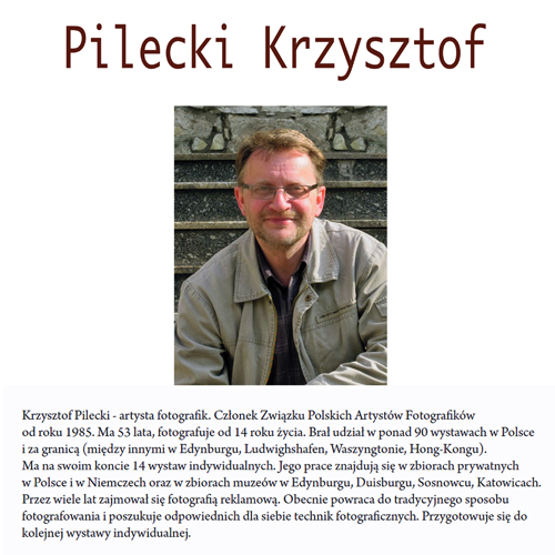 Galeria Łakomscy, drukarnia Progress oraz Związek Polskich Artystów Fotografików Okręg Śląski zapraszają na wystawę:Krzysztof Pilecki „Reminiscencje”. Wernisaż odbędzie się 21 listopada o godzinie 18.00. Wystawę można oglądać w Galerii Łakomscy mieszczącej się w Sosnowcu przy ulicy Wysokiej 9a