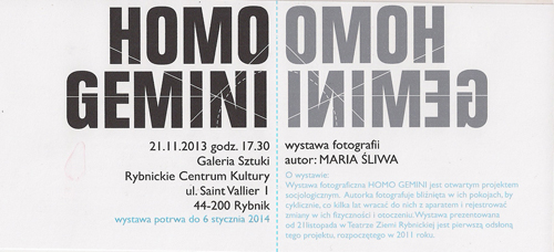Galeria Sztuki Rybnickie Centrum Kultury oraz Związek Polskich Artystów Fotografików Okręg Śląski zapraszają na wernisaż wystawy Maria Śliwa „Homo Gemini”. Wernisaż odbędzie się 21 listopada 2013 roku o godzinie 17.30.
