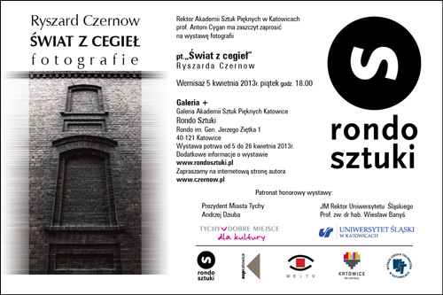 Związek Polskich Artystów Fotografików Okręg Śląski serdecznie zaprasza 05 IV 2013 o godz 18,00 na wernisaż wystawy fotografii: Ryszard Czernow “Świat z cegieł”.