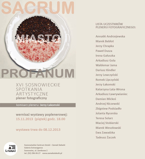 XVI Sosnowieckie Spotkania Artystyczne — VI Plener Fotograficzny to kolejne roczne podsumowanie pracy twórców sosnowieckiech i zaproszonych gości. Tym razem tematem przewodnim było „Miasto.Sacrum,profanum”. W urokliwym miejscu wsi Wiatrakowo koło Kazimierza nad Wisłą wśród kwitnących sadów i łąk spotkali się fotografowie na wspólnym plenerze z plastykami. Jedni zachwycali się Kazimierzem i jego historycznymi zabytkami, dla drugich Lublin był wielką niespodzianką. Jednych i drugich łączył jednak Sosnowiec. Czy udało się choć trochę rozwiązać zadanie ?
